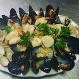 White pizza with shrimp, chopped clams, scallops, garlic, and parsley.